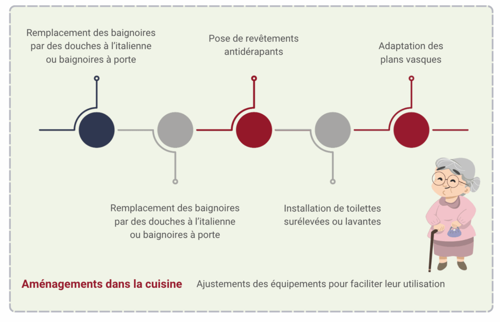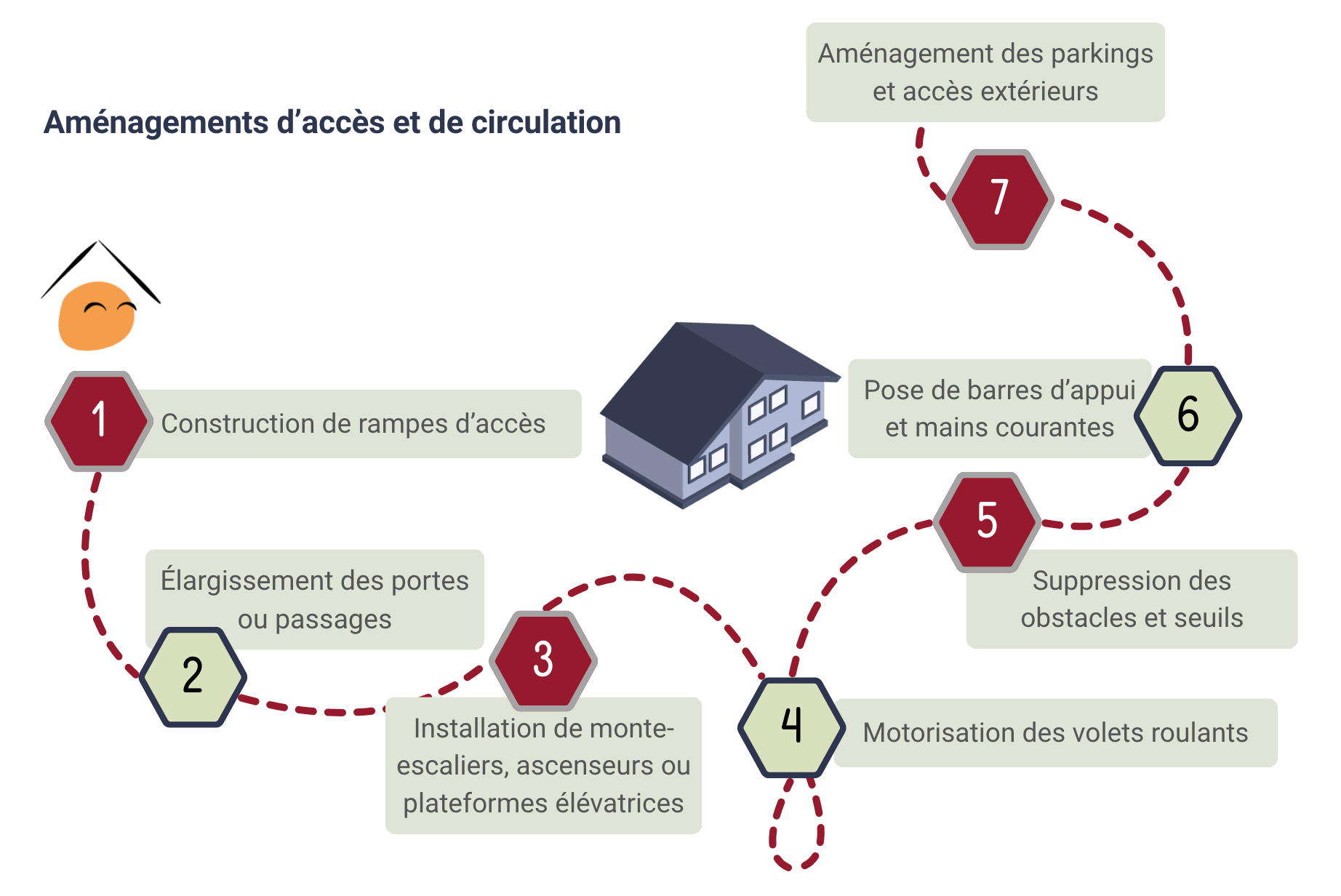 Les travaux financés concernent principalement l’amélioration de l’accessibilité et la sécurité du logement, notamment pour les personnes à mobilité réduite. Voici les principaux aménagements concernés :
